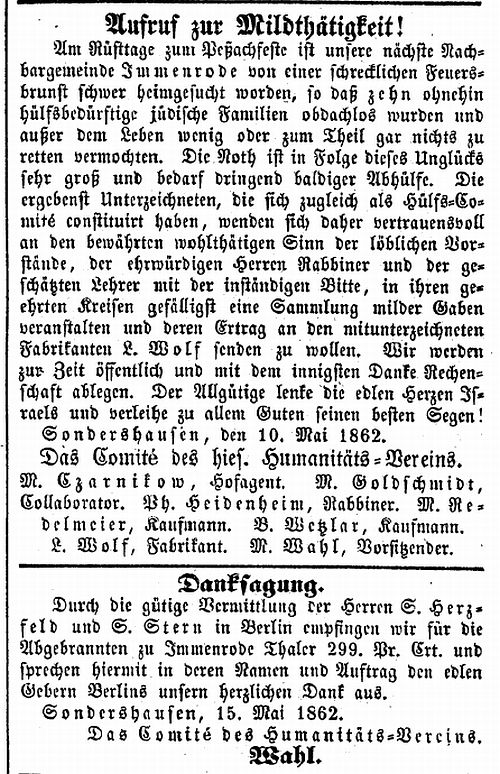edlen Gebern Berlins unsern herzlichen Dank aus. Sondershausen, 15.