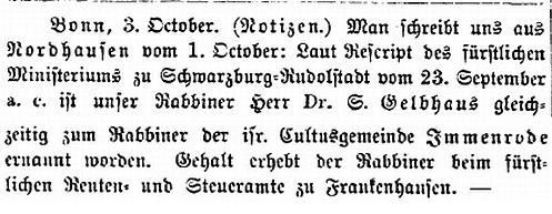 Rabbiner für Immenrode war der in Schwarzburg-Sondershausen tätige