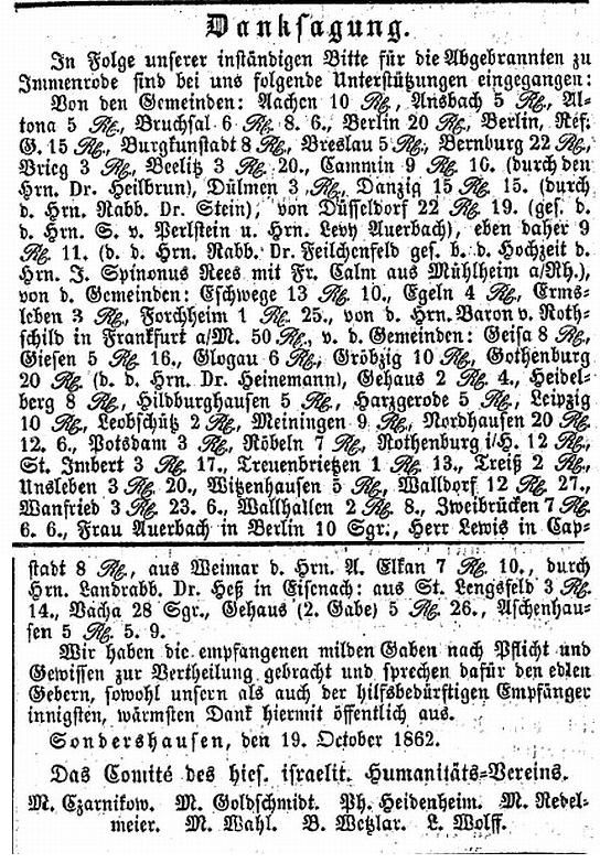und S. Stern in Berlin empfingen wir für die Abgebrannten zu Immenrode