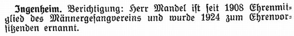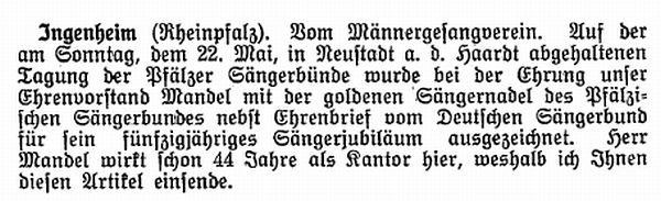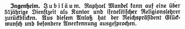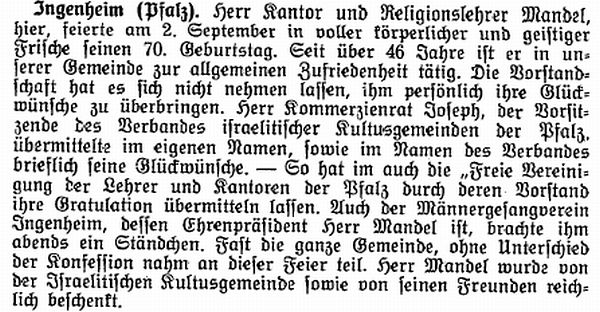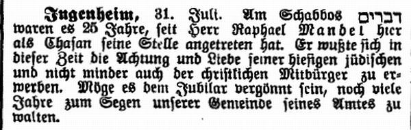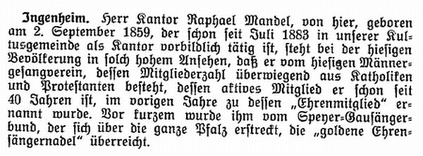 Mandel. 1903 war Lehrer E. Strauß, Kantor und Schochet R. Mandel,