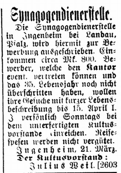 Gemeinde ein Kantor und Schochet (siehe unten die Ausschreibung von 1881