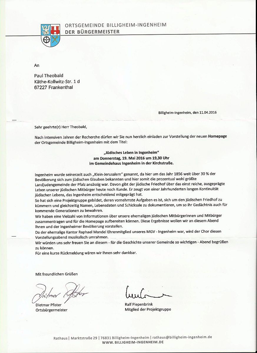 Einladung des Bürgermeister der Ortsgemeinde Billigheim-Ingenheim vom 11.