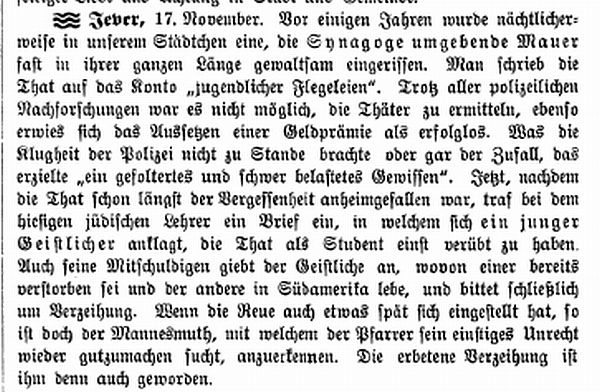 JEVER Vor 80 Jahren, in der Nacht zum 10. November 1938, wurde die Synagoge in Jever durch Brandschatzung zerstört. Fanatische Nazis hatten die schönste Synagoge des Oldenburger Landes in Brand gesetzt – wie es in der Pogromnacht überall im Land geschah. Über die Geschichte des 1880 errichteten Bauwerks, seine Bedeutung für das jüdische Leben im Jeverland und seine Zerstörung hat der Historiker Hartmut Peters eine lesenswerte Abhandlung verfasst, die die neuesten Erkenntnisse zur jeverschen Synagoge umfasst.