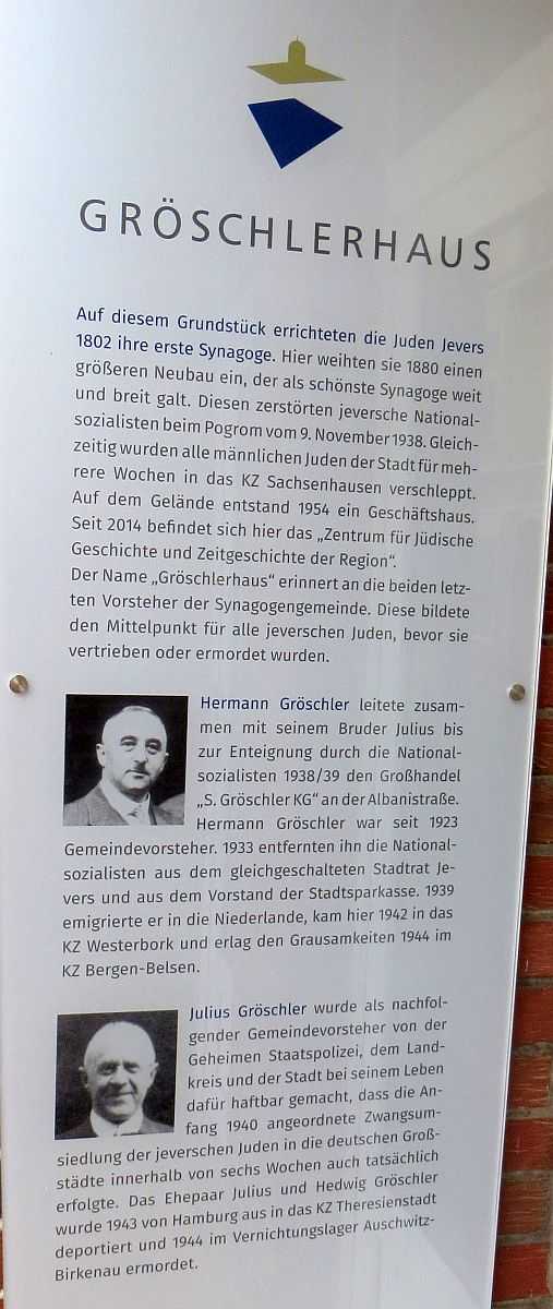 Peters erinnert nicht nur an die Synagoge, sondern widmet sich auch ausführlich dem Thema, warum es Jahrzehnte dauerte, dass die Geschichte um den Synagogenbrand gründlich aufgearbeitet werden konnte und sich die Stadt dem Umgang mit ihrer jüdischen Geschichte stellt. Mittlerweile sorgt der Arbeitskreis Gröschlerhaus (nach einer jüdischen Familie) für die Erinnerungsarbeit im Jeverland. Die am Sonntag im Gröschlerhaus in Jever (Wasserpfortstraße 19) eröffnete Dauerausstellung zur Geschichte des jüdischen Lebens ergänzt