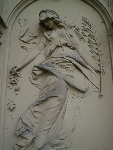 Friedhof mehrere hohe Grabsteine mit großen Engelsfiguren, Grabstein