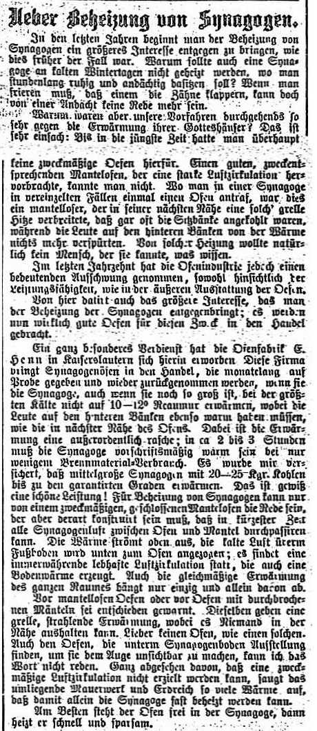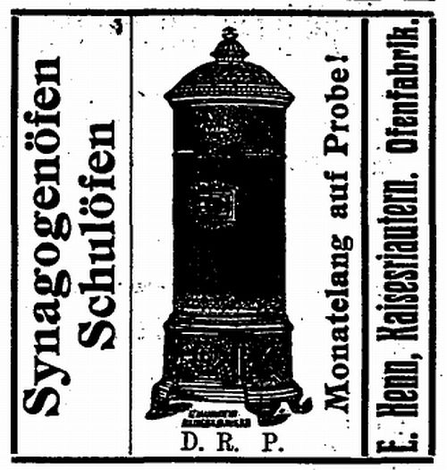 Werbung für Synagogen- und Schulöfen der Ofenfabrik E. Henn, Kaiserslautern (1902