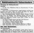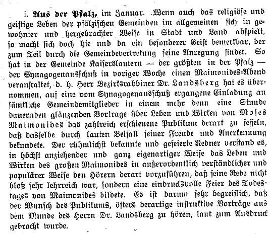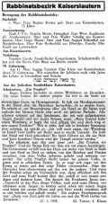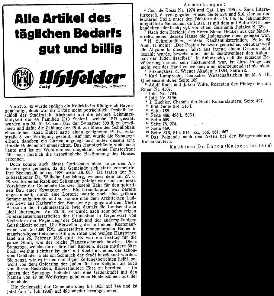 von Rabbiner Dr. Baron: "Die jüdische Kultusgemeinde Kaiserslautern"