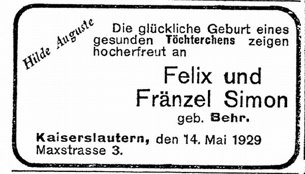 einer Tochter von Felix Simon und Fränzel geb. Behr (1929)