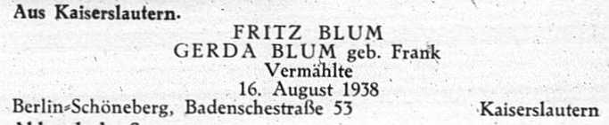 von Fritz Blum und Gerda Blum geb. Frank (1938)