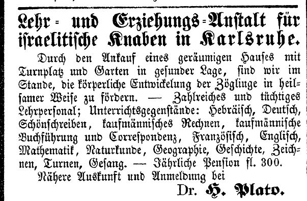 Anzeige der Lehr- und Erziehungsanstalt von Dr. H. Plato