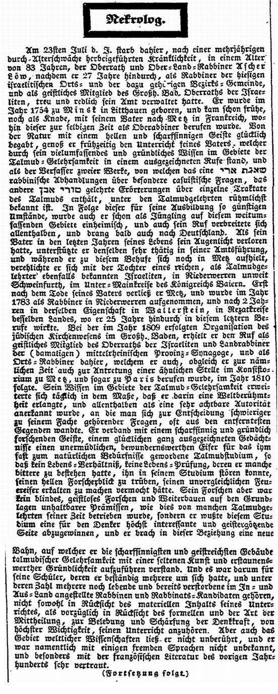 - 1809 bis 1837: Rabbiner Ascher Löw (ben Aryeh Löb; geb. 1754