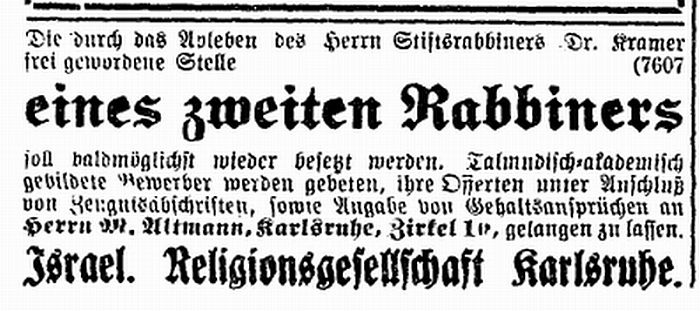 dann rabbinische Funktionen in der Stadt aus (in den Karlsruher Adressbüchern