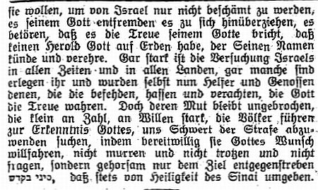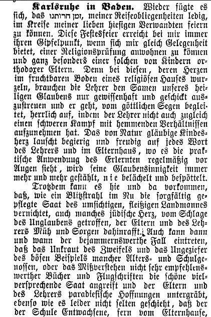 Trotzdem kann es hie und da vorkommen, dass, wie ein Blitzstrahl im Nu die sorgfältig gepflegte Saat des umsichtigen, fleißigen Landmannes vernichtet, auch manches jüdische Herz, vom Schlage des Unglaubens getroffen, der Eltern und des Lehrers Müh und Sorgen dahingerafft. Auch kann dann und wann der bejammernswerte Fall eintreten, dass das Unkraut des Zweifels und das Ungeziefer des bösen Beispiels mancher Alters- und Schulgenossen, oder das Missverstehen nicht sehr empfehlenswerter Bücher und Flugschriften die schöne vielversprechende Saat angreift und der Eltern und des Lehrers paradiesische Hoffnungen untergräbt, ebenso wie es leider nicht selten geschieht, dass der der Schule Entwachsene, fern vom Elternhause,