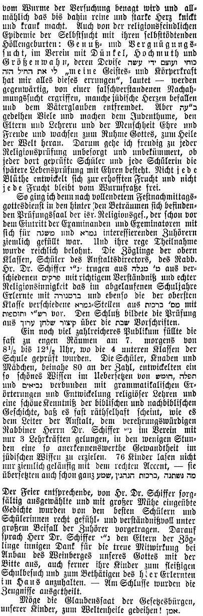 Pentateuch, Gebet und Propheten verbunden mit grammatikalischen Erörterungen und Entwicklung religiöser Lehren und eine schöne Kenntnis der biblischen und nachbiblischen Geschichte, dass es fast rätselhaft scheint, wie es dem Leiter der Anstalt, dem verehrungswürdigen Rabbiner Herr Dr. Schiffer