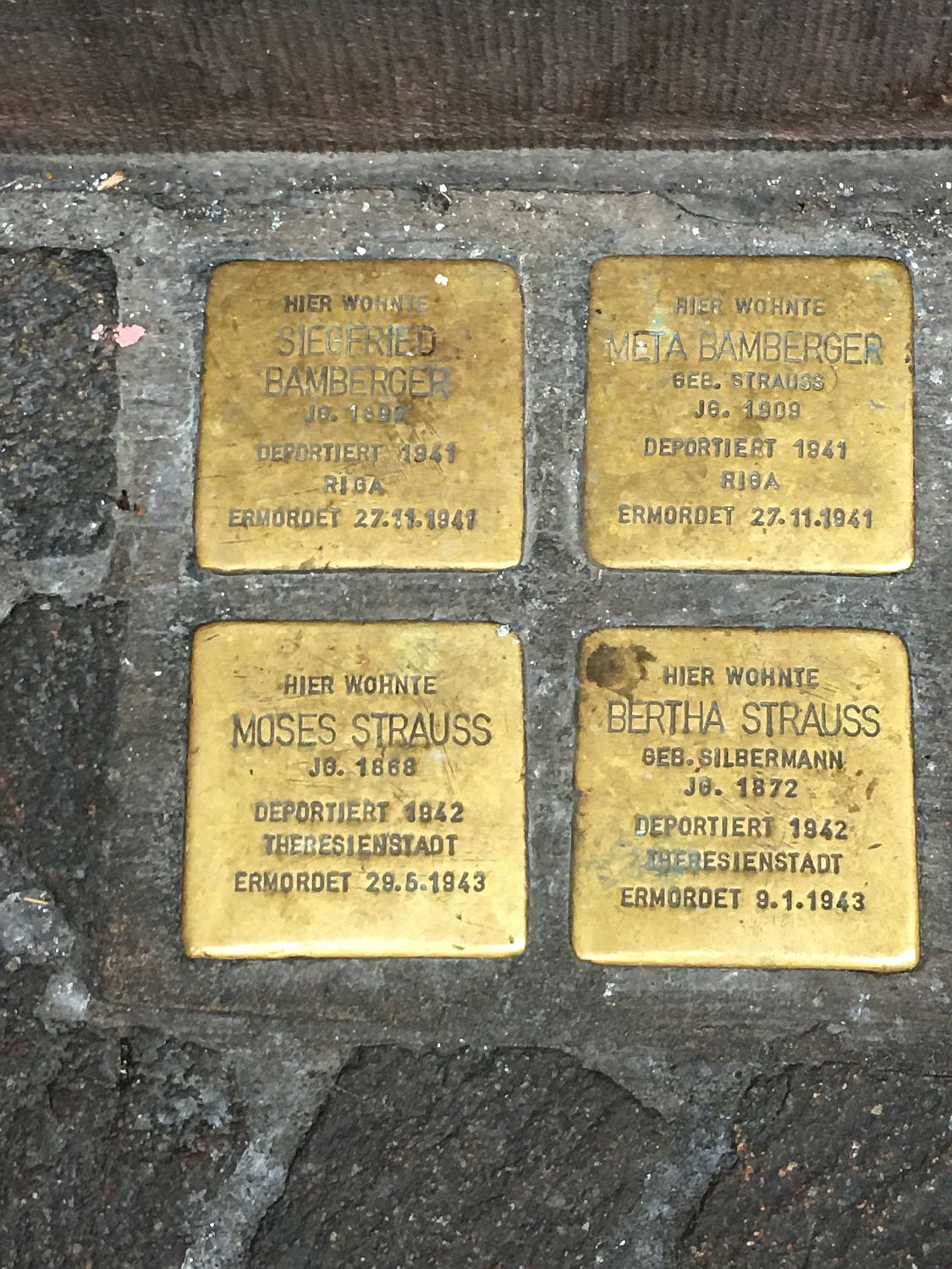 Mühlecke 5 erinnern an Julius Berney und Hannchen Berney. In der Rathausstraße 10 liegen die Steine zum