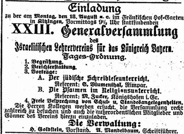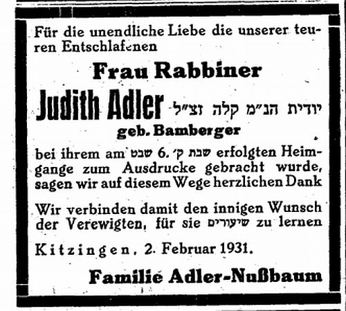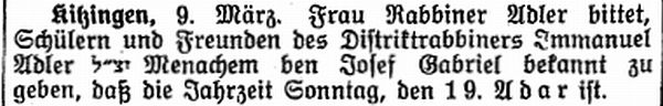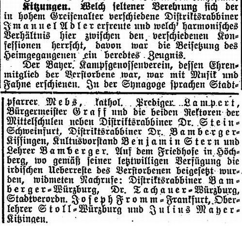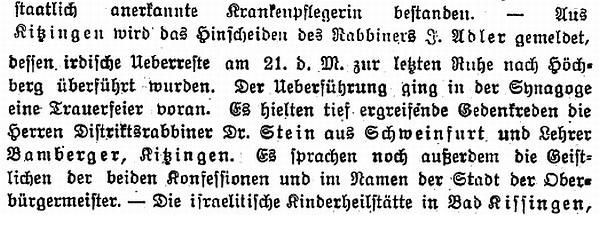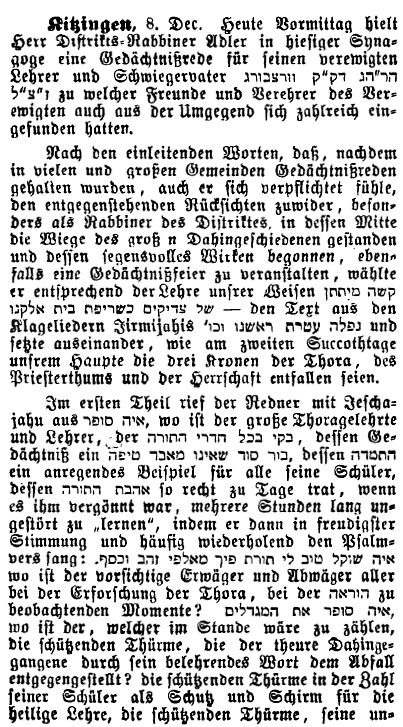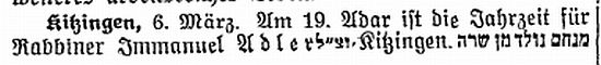 unseres hochverehrten Herrn Distriktrabbiners J. Adler von Mainbernheim