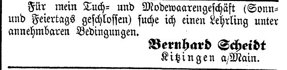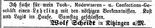 Sabbat und Feiertage ist das Geschäft geschlossen. Wolf Scheidt, Kitzingen".