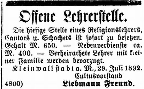 Lehrer Simon Grünfeld) angestellt, der zugleich als Vorbeter und Schochet
