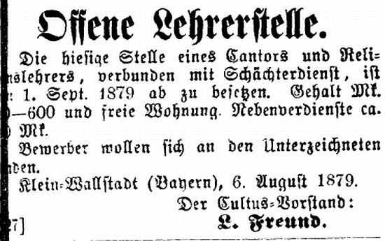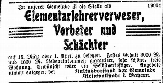 Lehrer, Kantor und Schochet in Kleinwallstadt. Es gab in diesem Jahr in der