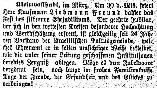 Von den Gemeindevorstehern werden genannt: Um 1871 Max Freund, um 1879/1899 Liebmann Freund.