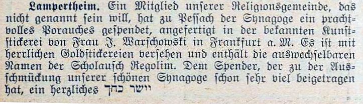 Artikel in der Zeitschrift "Der Israelit" vom 4. Februar 1892: "Lampertheim