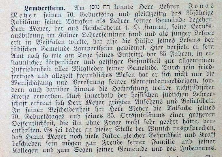 Joseph, der 1885 sein 25-jähriges Jubiläum als Lehrer und Kantor der Gemeinde Lampertheim feiern