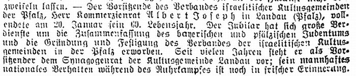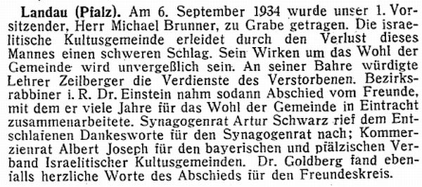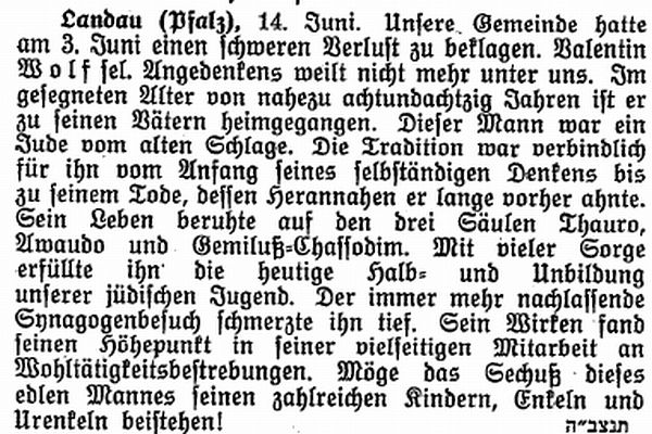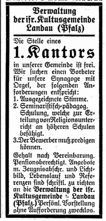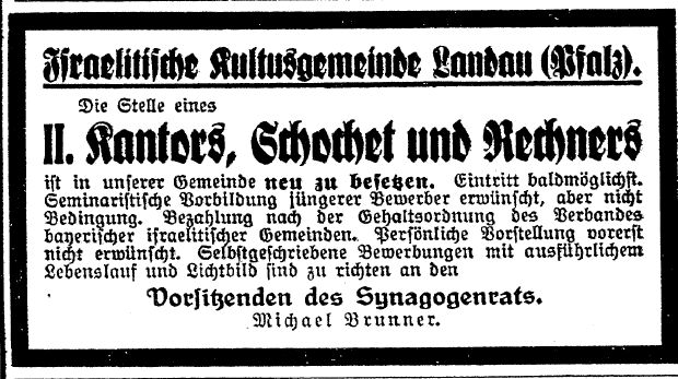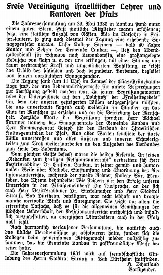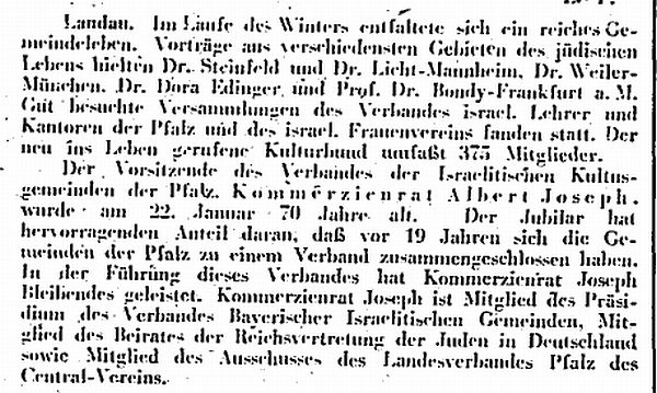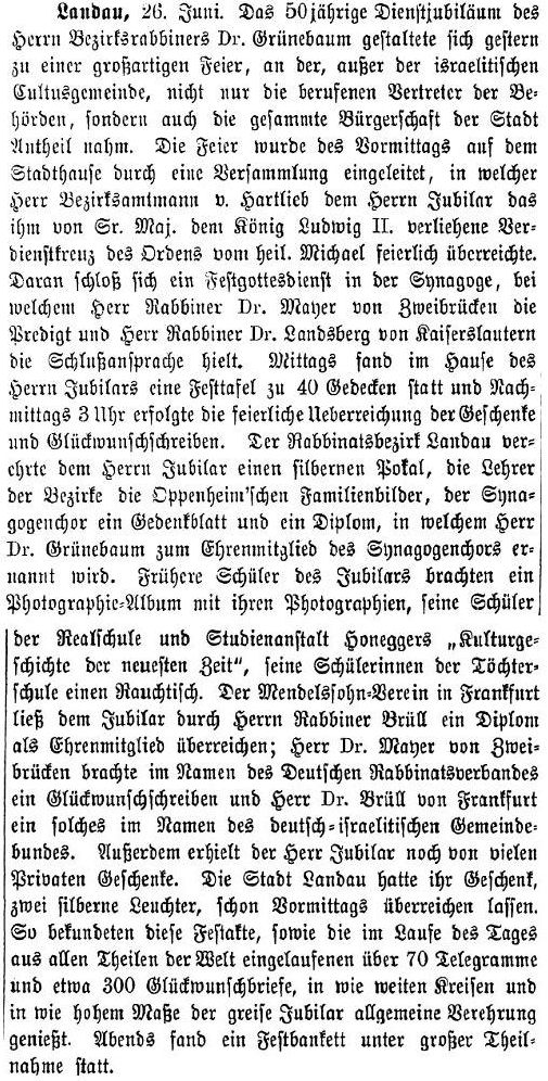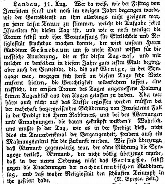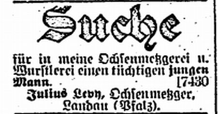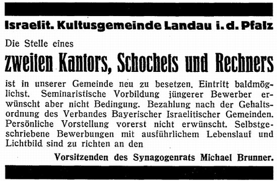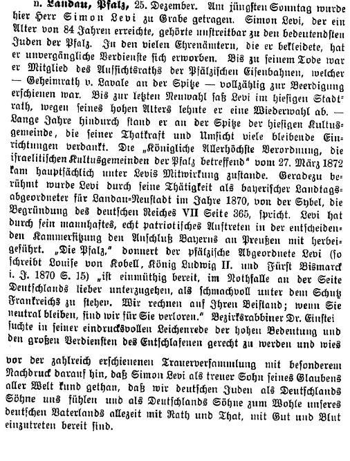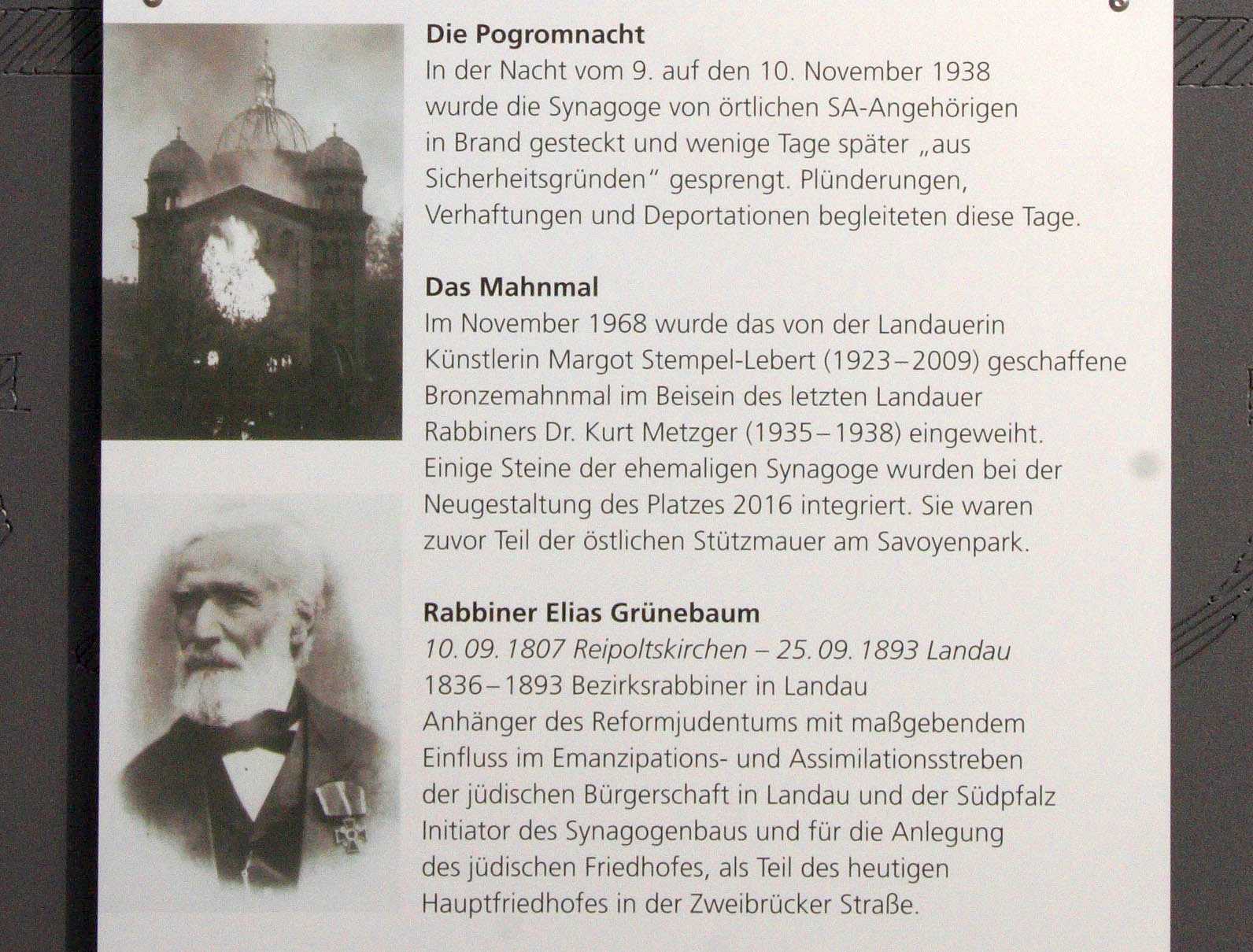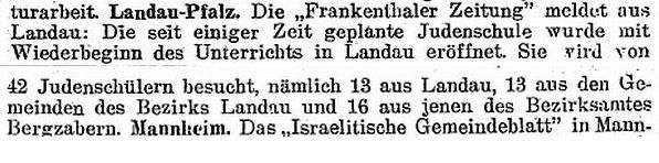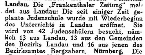 Landau Palatinate. First mention of a Jew dates from 1273 and a small Jewish community existed by 1292. The Jews abandoned the town in the Black Death persecutions of 1348-49, returning in 1353. Their number war restricted to ten families in 1517. They engaged in moneylending and traded in spices and and medicinal herbs. In 1541, the city council required them to wear a yellow badge and in the following year their trading rights were subject to severe restrictions. A synagogue was opened in 1648 and a new one was built after it burned down in 1691. In the early 18th century, Jews monopolized the salt, textile and wine trade, supplied nearby army camps with food, and dealt in cattle and grain. Dr. Elias Gruenebaum became regional rabbi in 1837 and served for 57 years, advocating both religious reform and equal rights for Jews. A new and luxurious synagogue was consecrated in 1884. A private Jewish school was opened in 1837 but closed in 1869 when the town's parochial schools were amalgamated. In 1864-67, two Jews served on the municipal council. Simon Levi became community chairman in 1870, serving in the Landrat and sitting on the municipal council from 1868 to 1900. Jews continued to be elected to the municipal council until the Nazi era. The Jewish population rose from 237 in 1810 to a peak of 821 (of a total 15.824) in 1900. In the 1890s and through the Weimar period, over 60 % of the wine merchants in the city were Jews.