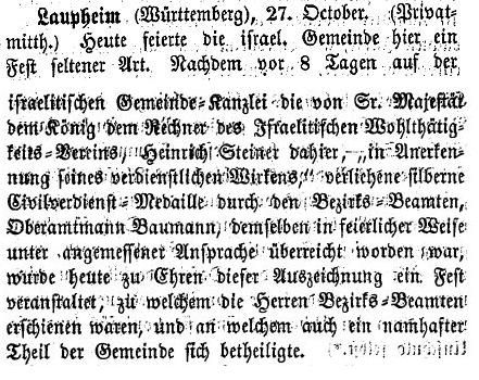 vom 26. November 1861: "Herr Steiner in Laupheim,