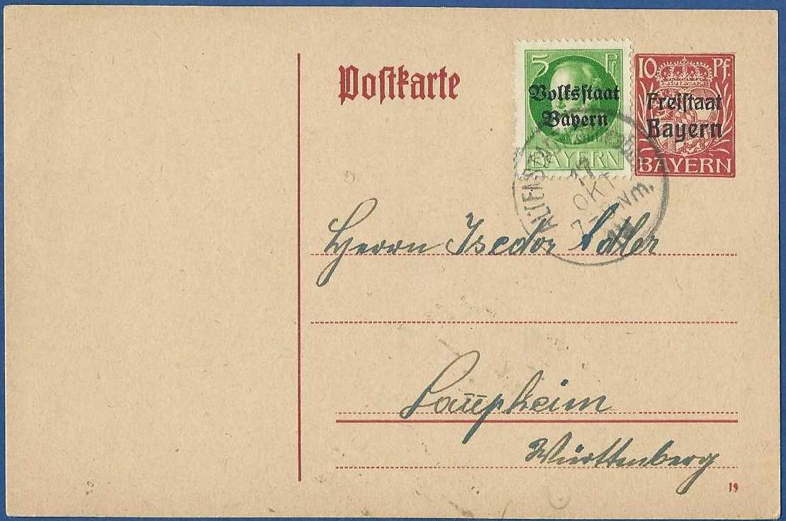 17. Oktober 1919 verschickt. Die Rückseite gibt einen Einblick in die Produktenpalette der Kolonialwarengroßhandlung Isidor Adler.