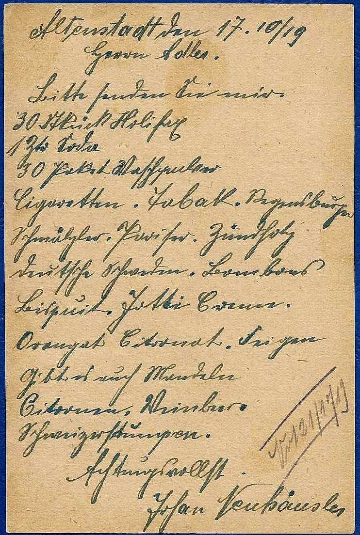 Bestellt wurden unter anderem 1 Zentner Soda, 30 Pakete Waschpulver, Zigaretten, Tabak, Schnupftabak,