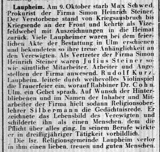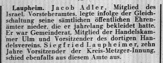 Laupheimer Handelsvereins war bis 1933 auch im Gemeinderat Laupheim aktiv.