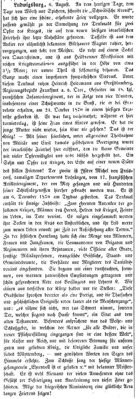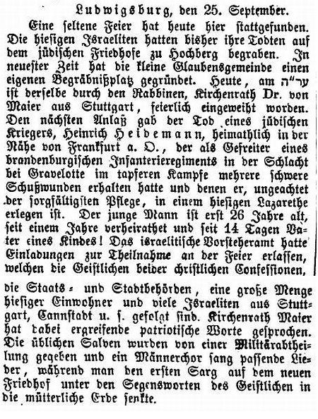 in der Zeitschrift "Der Israelit" vom 5. Oktober 1870: "Ludwigsburg,