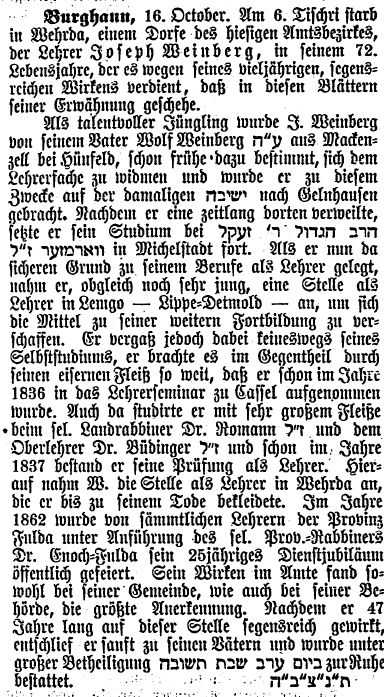 Hierauf nahm Weinberg die Stelle als Lehrer in Wehrda an, die er bis zu