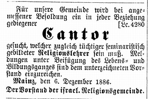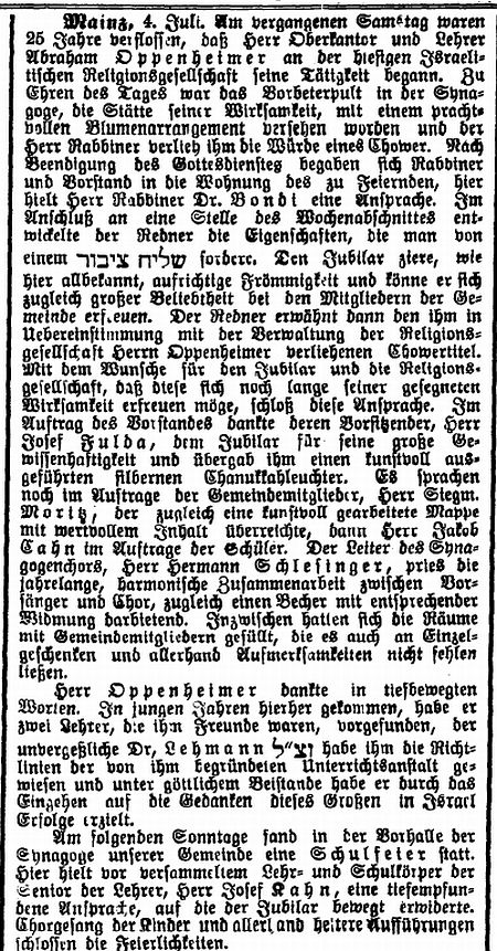 Abraham Oppenheimer kam im Jahre 1886 als Lehrer und Kantor nach Mainz,