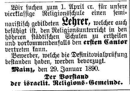 Prediger; 1846 Rabbinatsverweser in Mainz, 1851 zweiter Rabbiner in Mainz,