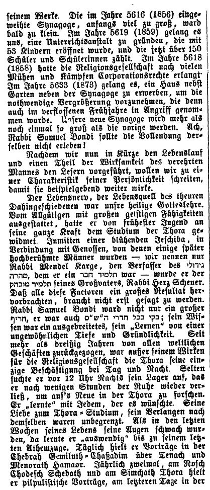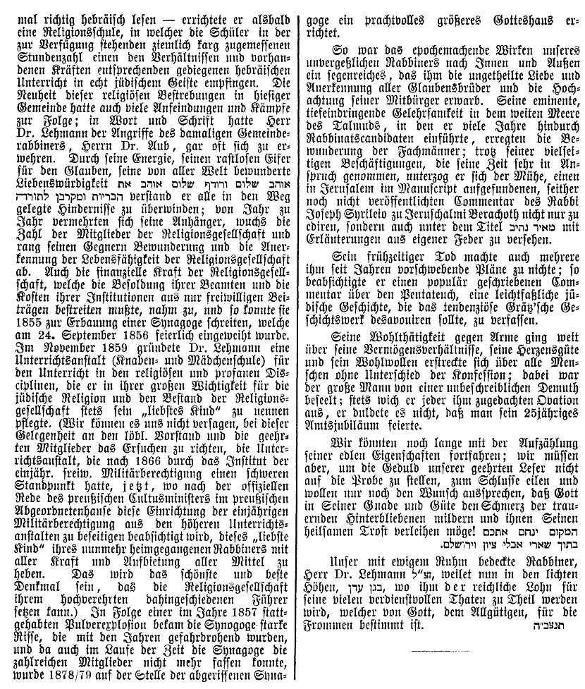 (Einweihung der neuen Synagoge mit Orgel 1853); von 1866 bis 1879 Rabbiner