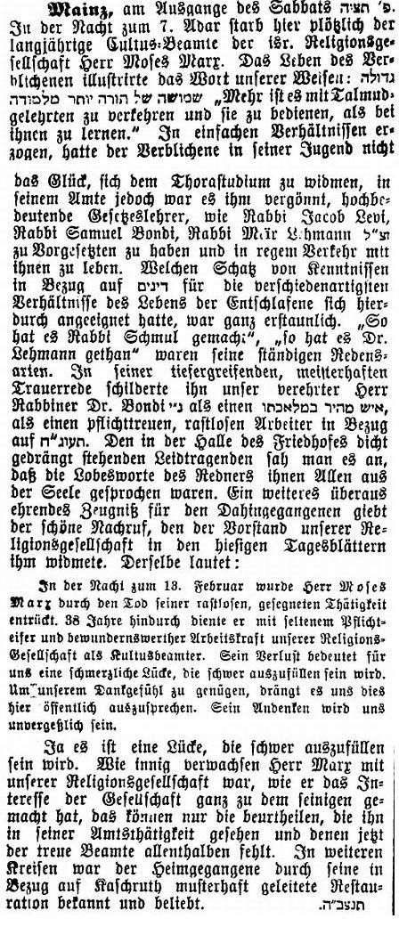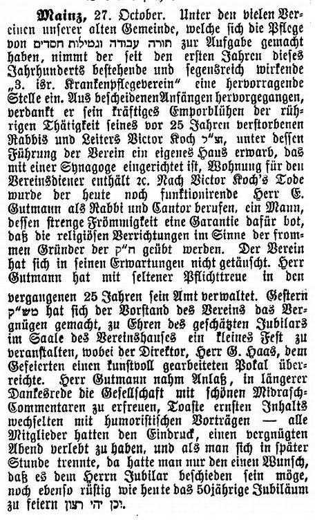 März 1941 Rabbiner in Mainz; war Vorsitzender des 1925 gegründeten Vereins
