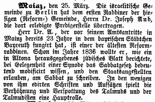 | 1852 bis 1866: Rabbiner Dr. Joseph Aub (geb. 1804 in