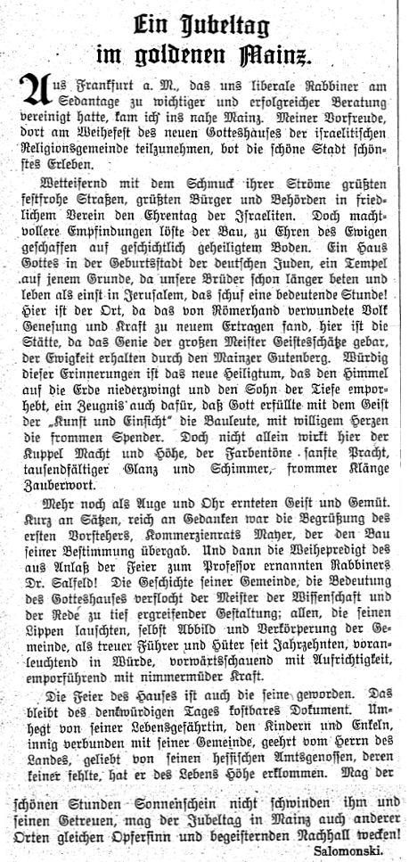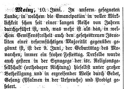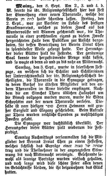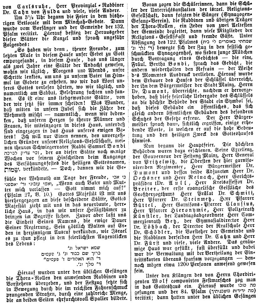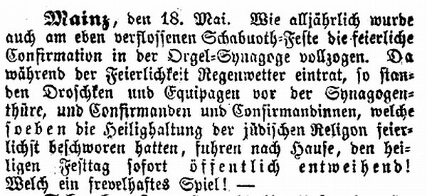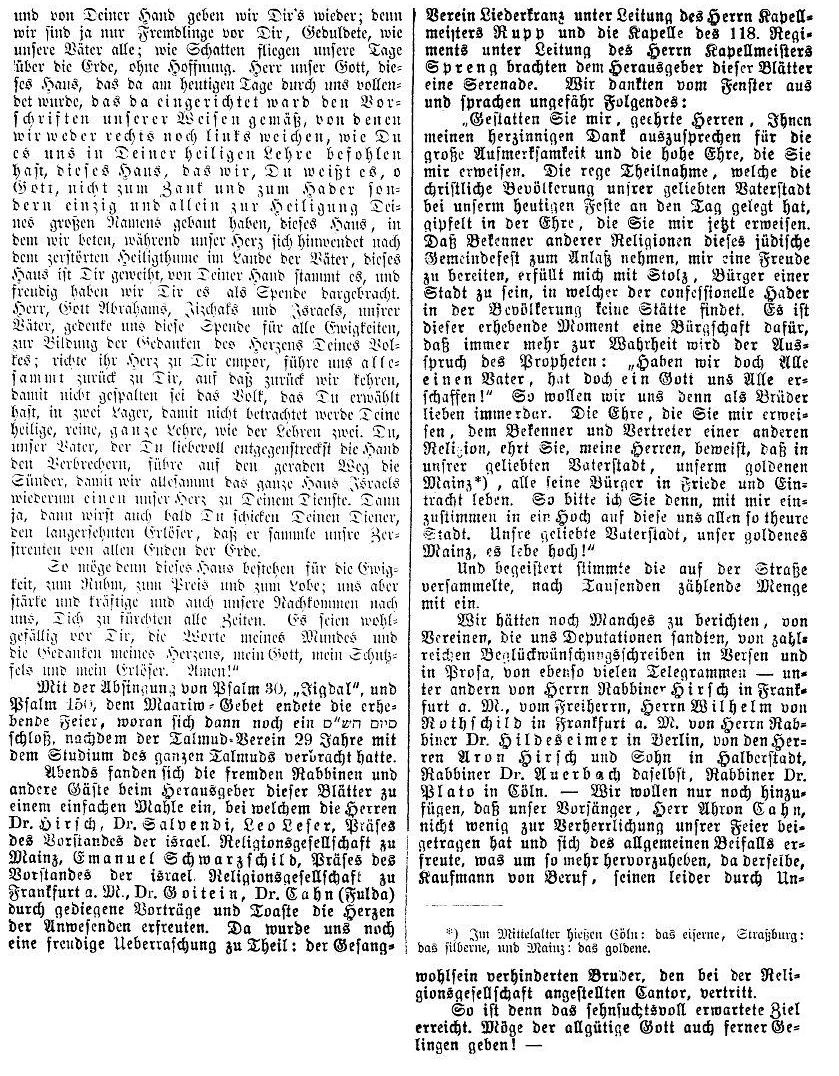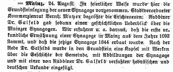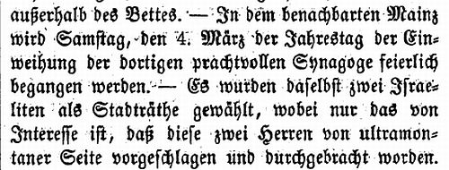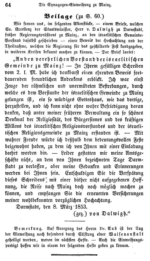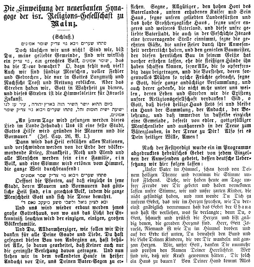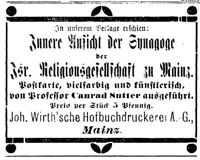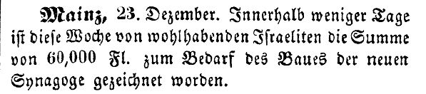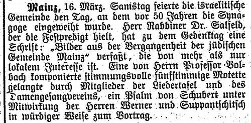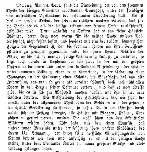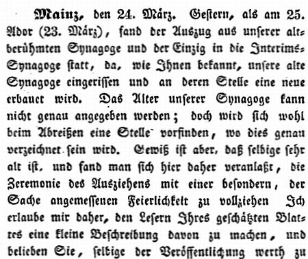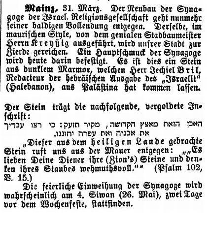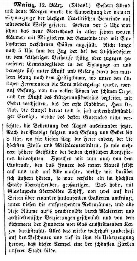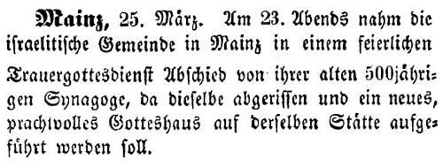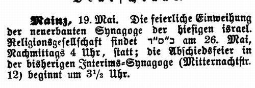 Wiederkehr des Einweihungstages (11. März 1853) der Hauptsynagoge. Mainz