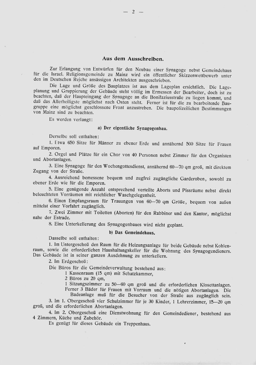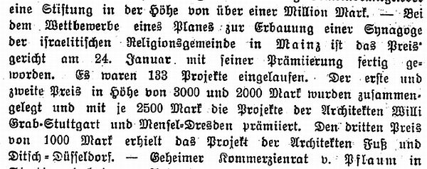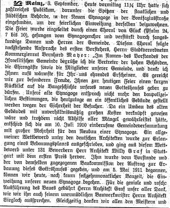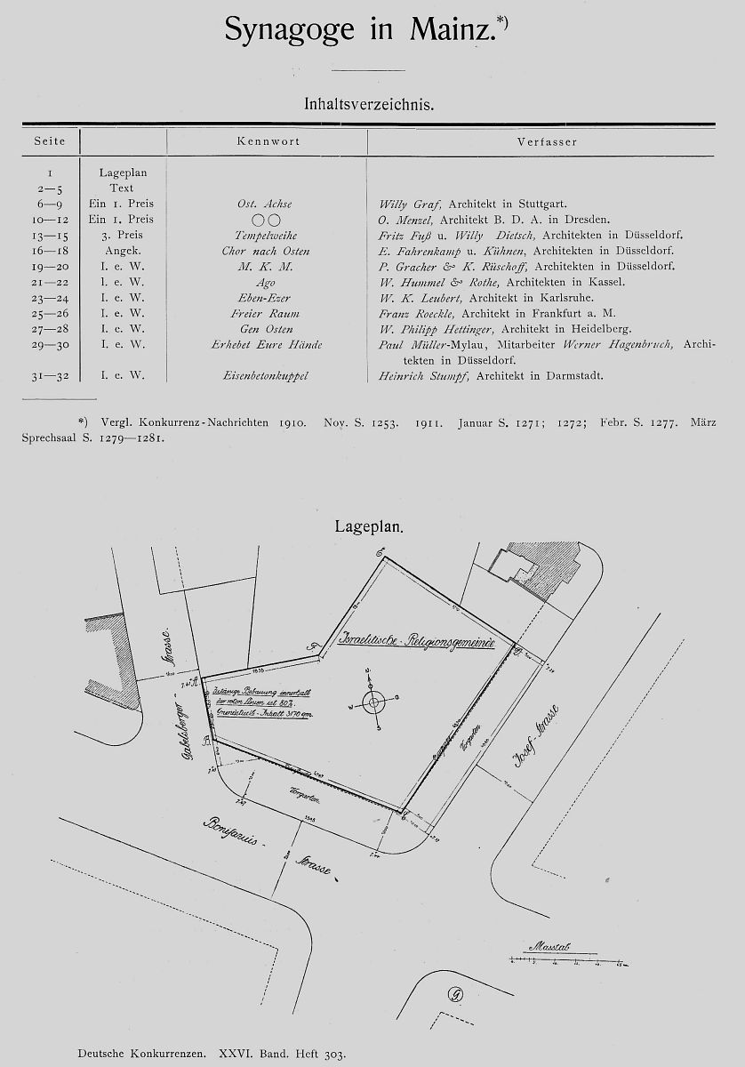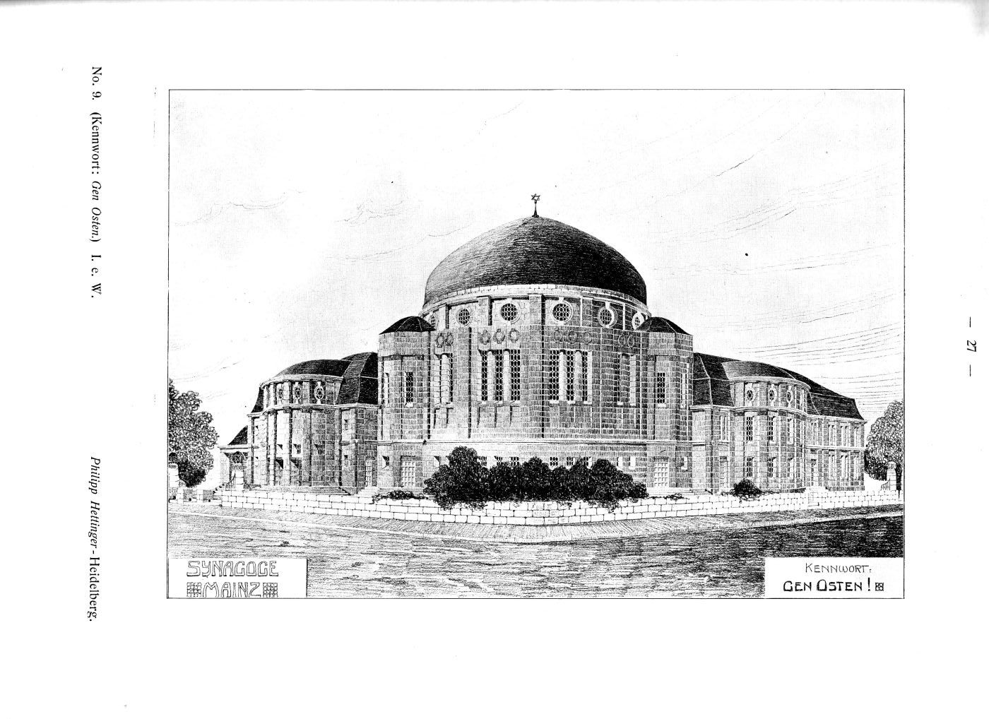 Unter den Baumeistern der prächtigen Mainzer Synagogen des 19. und frühen 20. Jahrhunderts finden sich bekannte Namen, wie Ignaz Opfermann, Eduard Kreyßig und Willy Graf. Die meisten dieser Gotteshäuser wurden im November 1938 geschändet und zerstört; die niedergehenden Bomben im Krieg machten dann auch noch die Reste der Bauwerke dem Erdboden gleich. Abgesehen von der restaurierten kleinen Weisenauer Synagoge künden heute nur noch einige Gedenktafeln von den früheren Gebetsstätten und Lehrhäusern der Mainzer Juden.