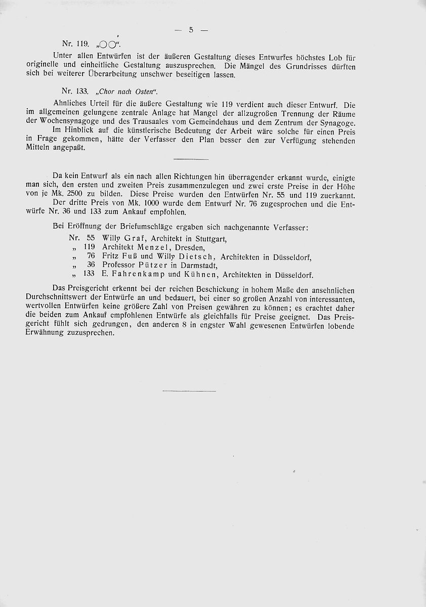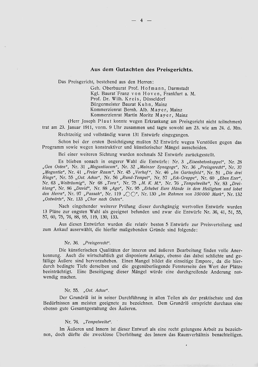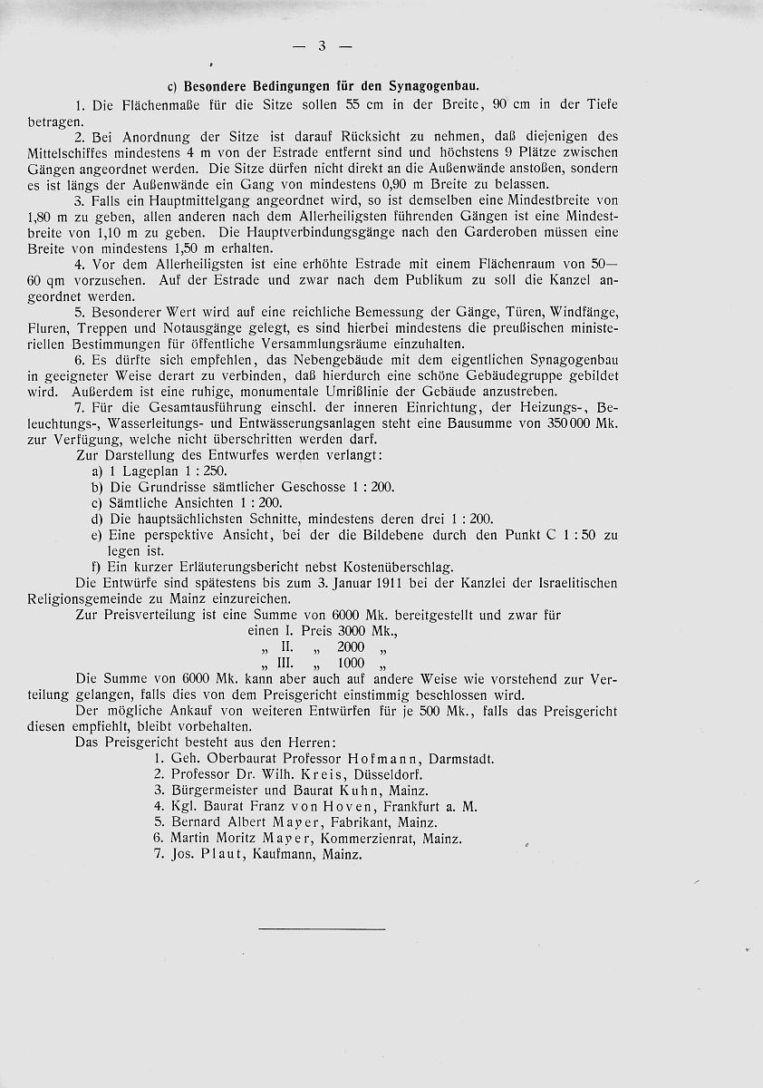 Unter den Baumeistern der prächtigen Mainzer Synagogen des 19. und frühen 20. Jahrhunderts finden sich bekannte Namen, wie Ignaz Opfermann, Eduard Kreyßig und Willy Graf. Die meisten dieser Gotteshäuser wurden im November 1938 geschändet und zerstört; die niedergehenden Bomben im Krieg machten dann auch noch die Reste der Bauwerke dem Erdboden gleich. Abgesehen von der restaurierten kleinen Weisenauer Synagoge künden heute nur noch einige Gedenktafeln von den früheren Gebetsstätten und Lehrhäusern der Mainzer Juden.