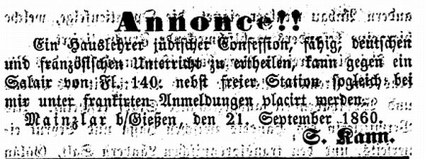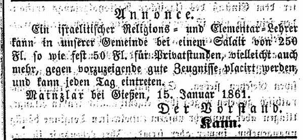 jüdischer Lehrer in Mainzlar ein Lehrer Blaut genannt (erwähnt in einem Bericht