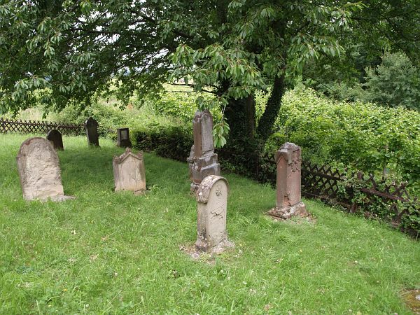 älterer Friedhof mit 43 erkennbaren Grabstellen und - separat davon und etwa 10 m