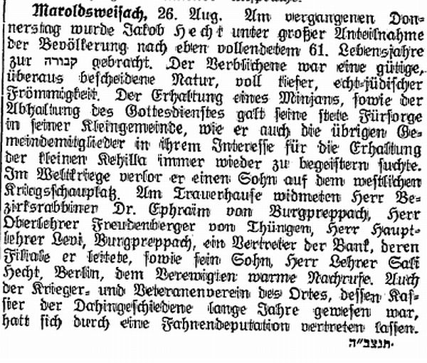 Im Ersten Weltkrieg fiel aus der jüdischen Gemeinde Max Hecht (geb.