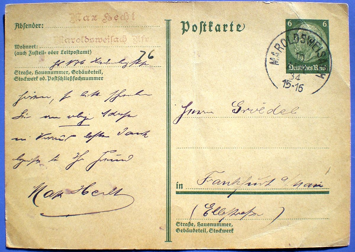 Hecht aus Maroldsweisach nach Frankfurt am Main am 10. April 1934.