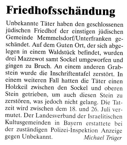 1999 wurde der Friedhof geschändet (siehe Bericht unten).