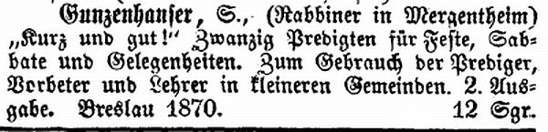 Anzeige in der Zeitschrift "Der Israelit" vom 11.