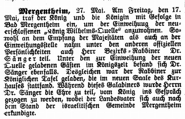 - Dr. Hirsch Sänger wird Bezirksrabbiner von Mergentheim