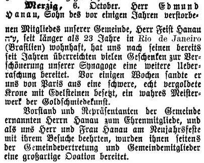 wird erstmals die Familie des Moyses Hanau in Merzig genannt. Diese hatte