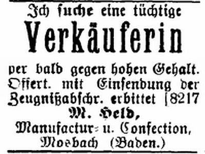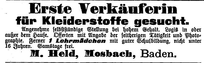 1910: "Erste Verkäuferin für Kleiderstoffe gesucht.
